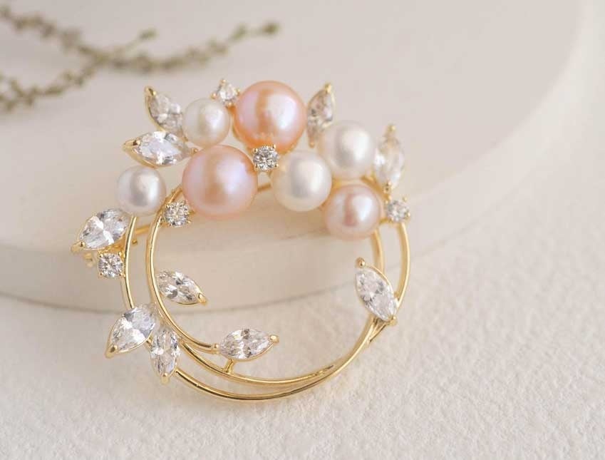 ホワイトとピンクベージュの美しい淡水パールをリースにあしらった上品なブローチ。