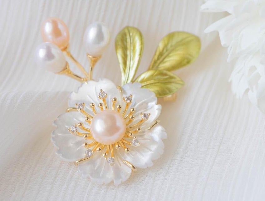 白蝶貝の桜の花とコーラルピンクとホワイトの淡水パールの桜のつぼみが咲く上品で優しい雰囲気のあるブローチ。