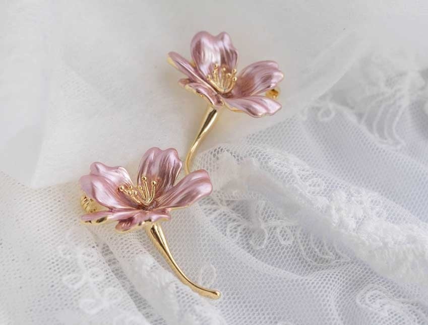 やさしいピンクの花びらが春風になびいたように、ふわっと咲く様子が可憐な桜のブローチは、 胸元につけるとまるで胸元に桜が咲いたかのよう。