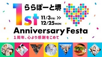 『三井ショッピングパーク ららぽーと堺』(以下、『ららぽーと堺』)では、この度オープン1周年を迎え、皆さまに感謝の気持ちを込めて、2023年11月3日(金・祝)~12月25日(月)まで『ららぽーと堺 1st Anniversary Festa』を開催します。第一弾は、11月3日(金・祝)~16日(木)に実施する1周年を記念した約100店舗以上でおトクにお買物を楽しめる『ららぽーと堺 1st Anniversary Sale』です。