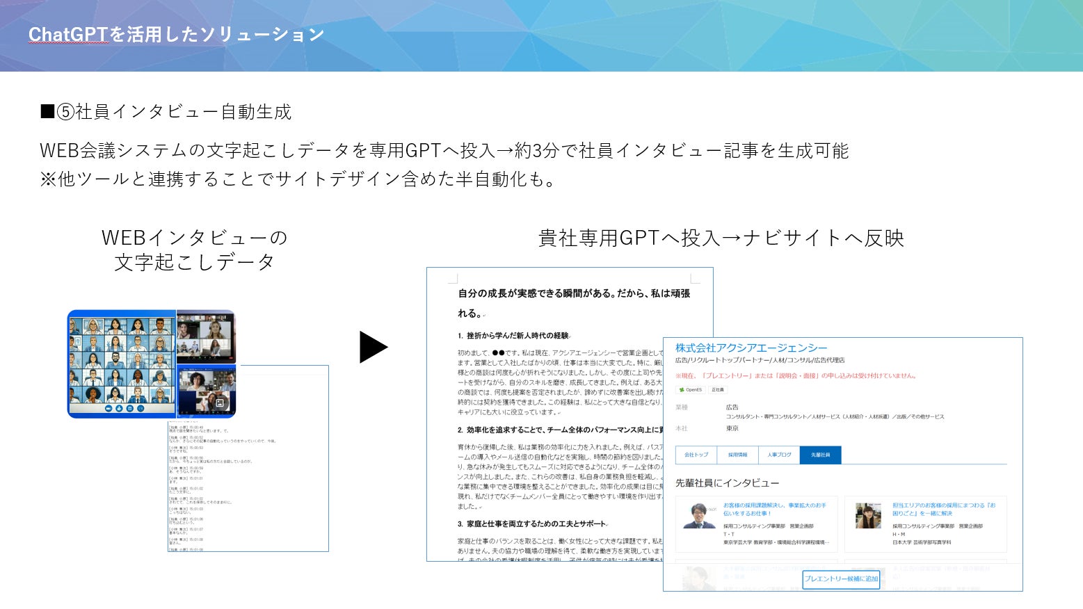 WEB会議等の文字起こしデータを用いて、わずか数分でインタビュー記事を生成。SNSや採用ページ、求人メディアへの掲載コンテンツ作成を大幅に効率化します。