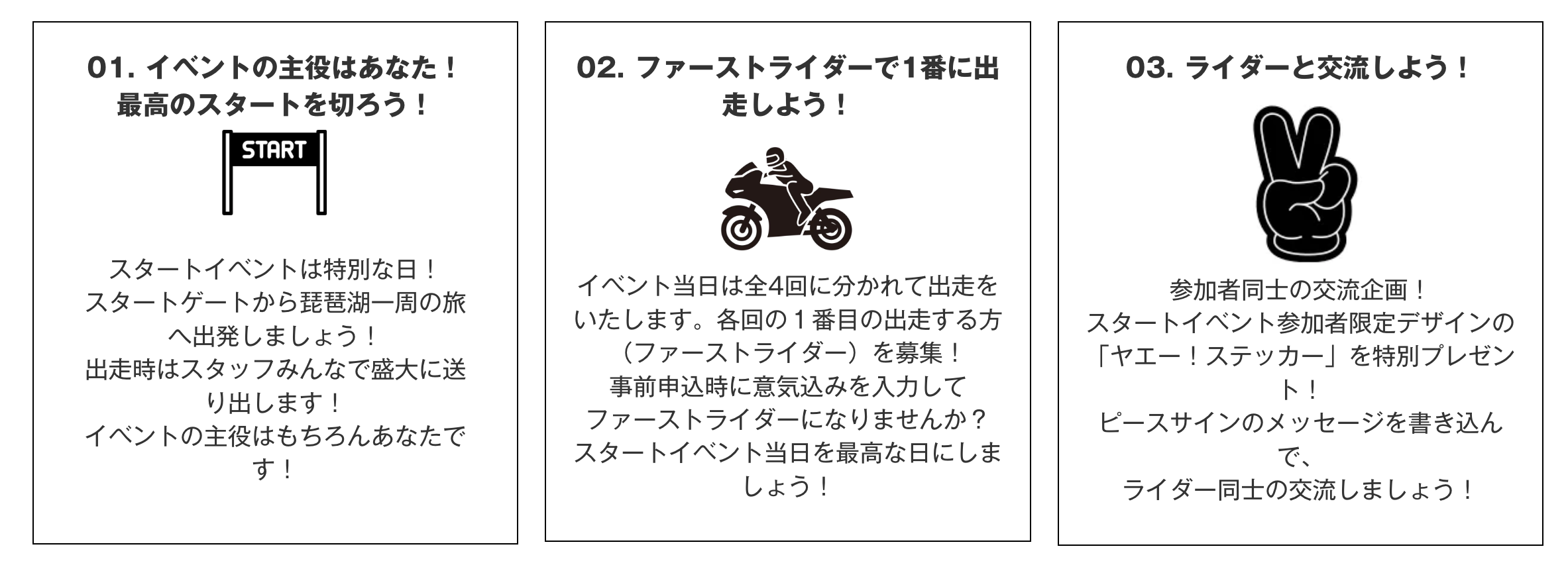今年は地元を知り尽くしたライダーを実行委員会メンバーに加えながら、こうした行政や地元企業・店舗様とともに、滋賀県の観光を盛り上げるべく、様々な企画やイベントを実施してまいります。