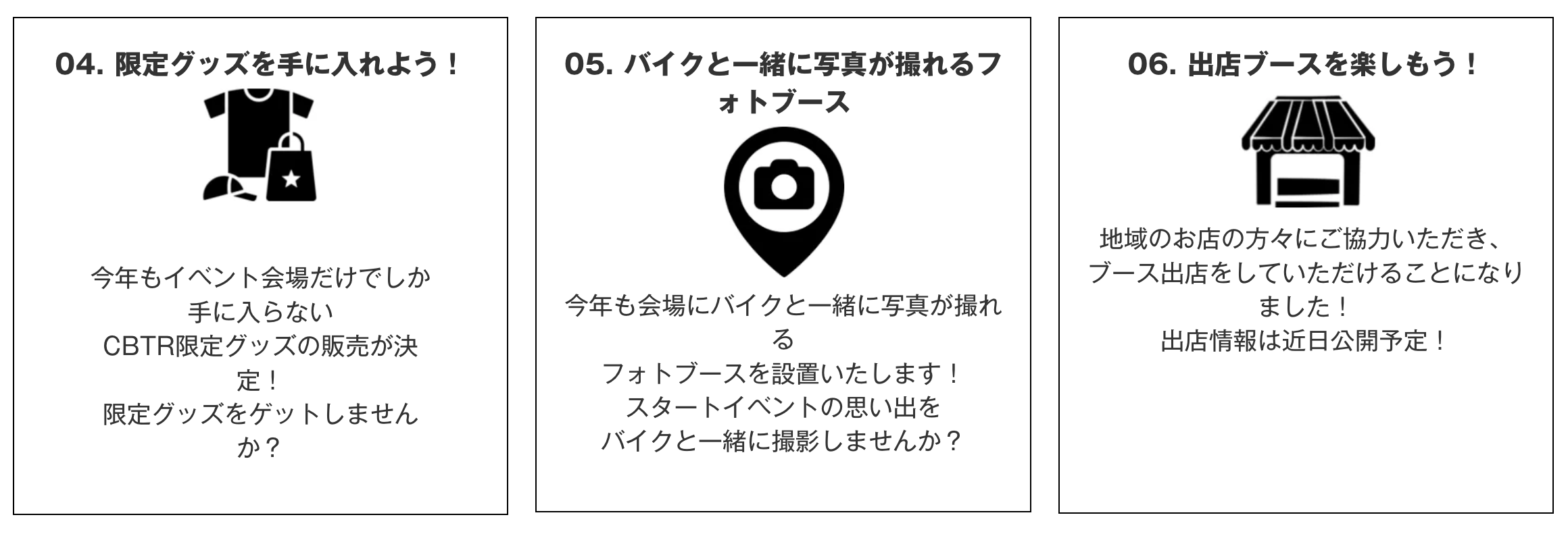 CBTR2024では9/14(土)に彦根市荒神山公園にてスタートイベントを開催。事前予約を7/31(水)12時より開始。各回250台の事前予約制でCBTR2024シーズンパスプランエントリー者限定。