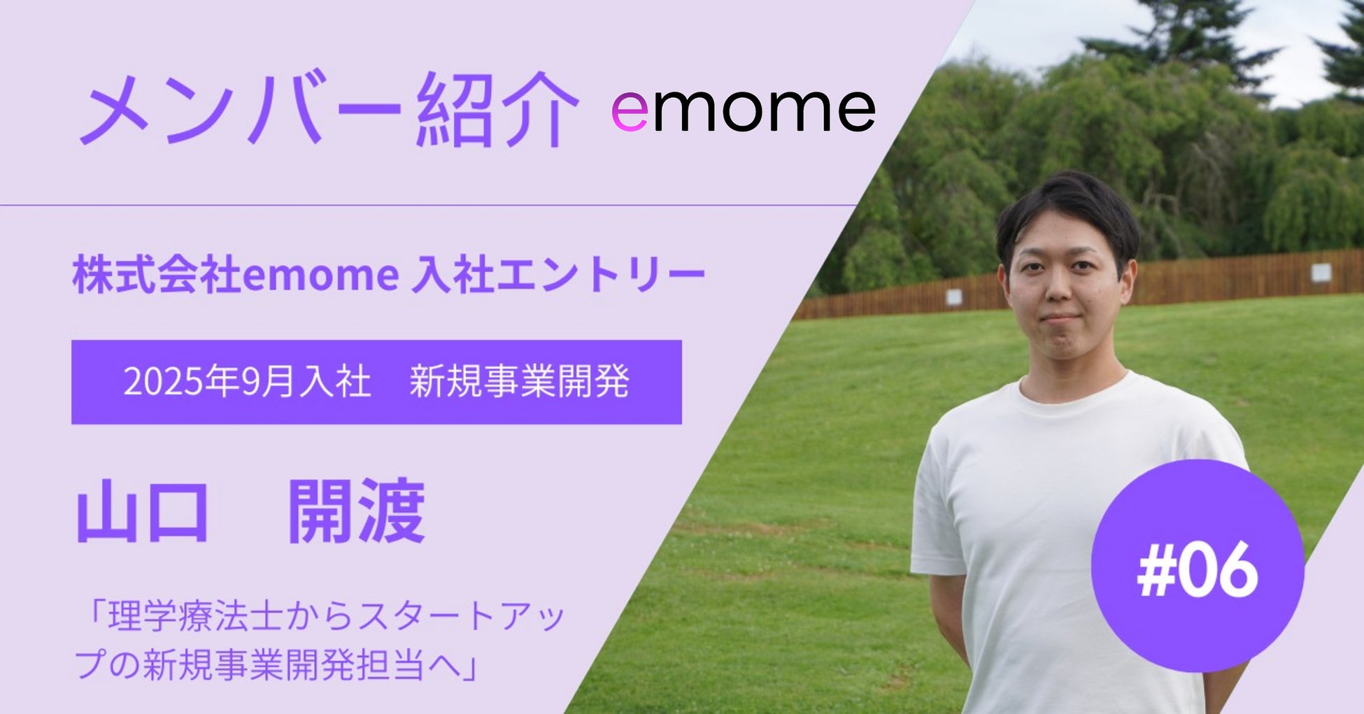 株式会社emome(読み: エモミー、本社:東京都港区、代表取締役:森山 穂貴)は、採用広報メディア「emome note」にて、「入社エントリーVol.6: 『理学療法士からスタートアップの新規事業開発担当へ』」を公開しました。