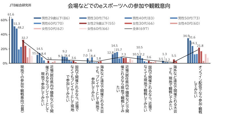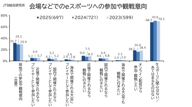 eスポーツを「知っている」と回答した人のうち、実際に現地に出向いてプレイや観戦をする意向については、「関心はない/あてはまるものはない」の割合が昨年度の70.9%から68.3%と減少しており、リアルでのeスポーツへの参加意向は微増で、特に男性29歳以下では61.6%と全体の倍近くの高い割合となりました。また、男性30代では51.3%、男性40代では48.2%、女性29歳以下では32.7%と、比較的高い関心がうかがえます(図8、図9)。