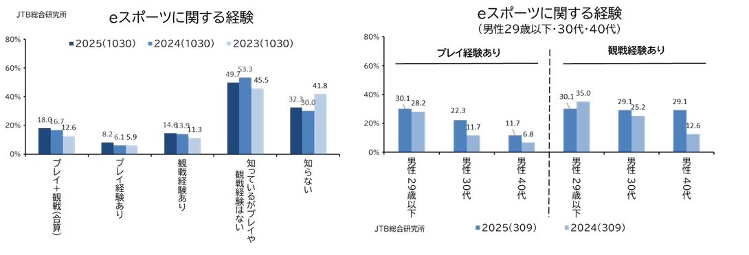 23年から24年にかけてeスポーツに対する認知度は大幅な向上を見せたものの、24年から25年にかけてはほぼ横ばいであったことを踏まえると、認知拡大は頭打ちになったのかもしれません。一方で、実際のプレイ・観戦経験者は3年連続で増加しています。これは男性40代のプレイ・観戦経験者の増加が一因であると考えられ、その増加も子どもの教育におけるeスポーツ接点の増加などに起因している可能性が推察できます(学校におけるeスポーツ部やeスポーツ専門学校など)。eスポーツ業界として、今後も「どのようにeスポーツを実際に体験してもらうか?」に重きが置かれると思いますが、子どもを軸に家族を巻き込んだeスポーツ体験を提供していくことが1つのポイントになってくるのかもしれません。