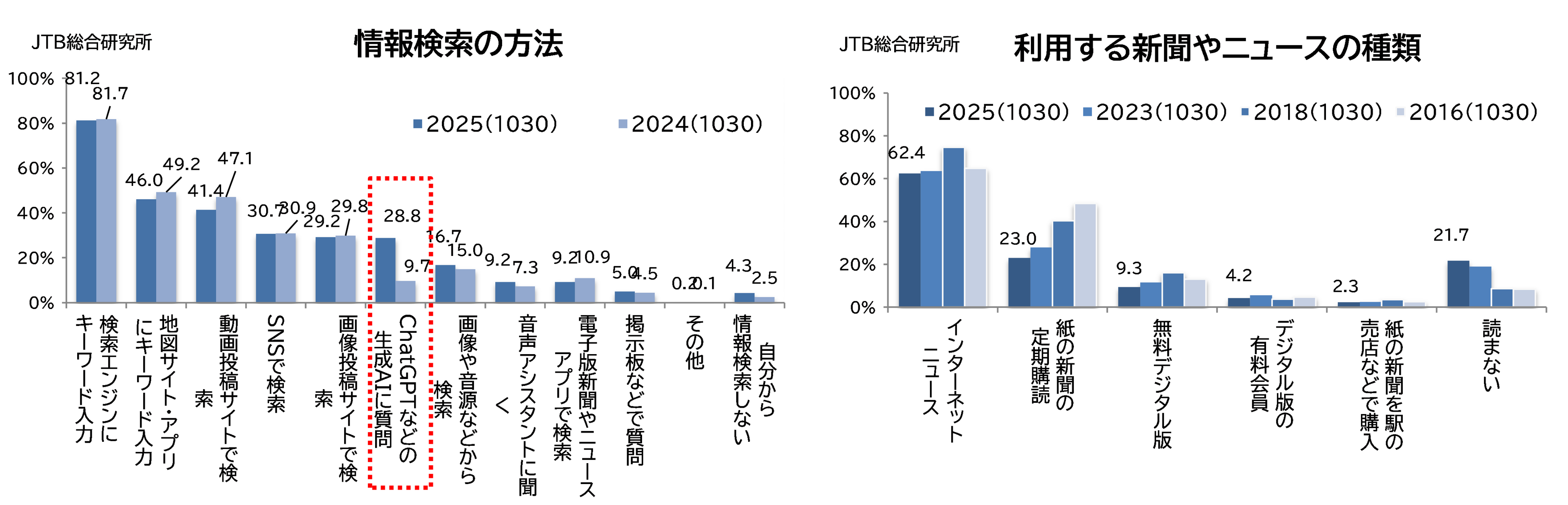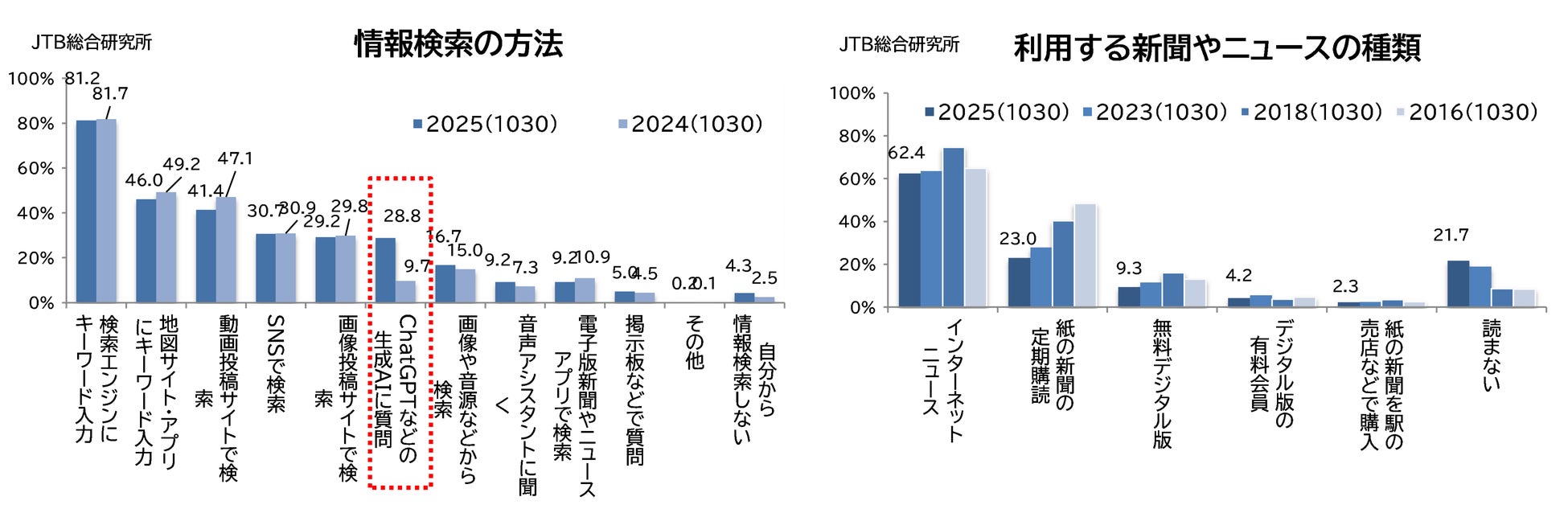 情報検索手段は、生成AIのみが上昇し、昨年の調査で注目された地図アプリや動画投稿も微減に
