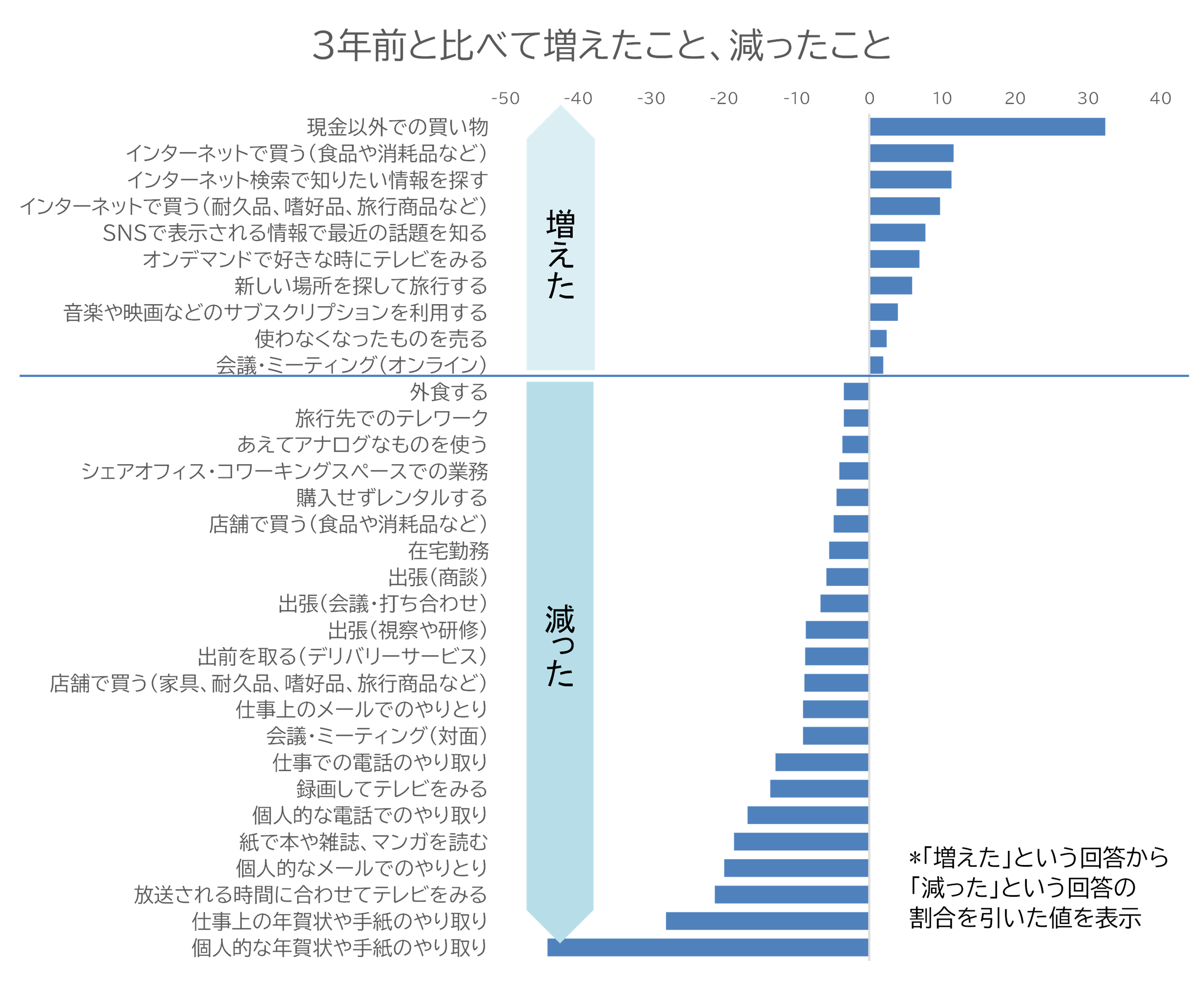 3.生活の中で、3年前と比較して増えたこと、減ったこと:キャッシュレス化やネット購入は一段と浸透。コロナ禍で普及した「会議・ミーティング(オンライン)」は残ったが、「旅行先でのテレワーク」や「シェアオフィス・コワーキングスペースでの業務」、「在宅勤務」などは減少傾向へ