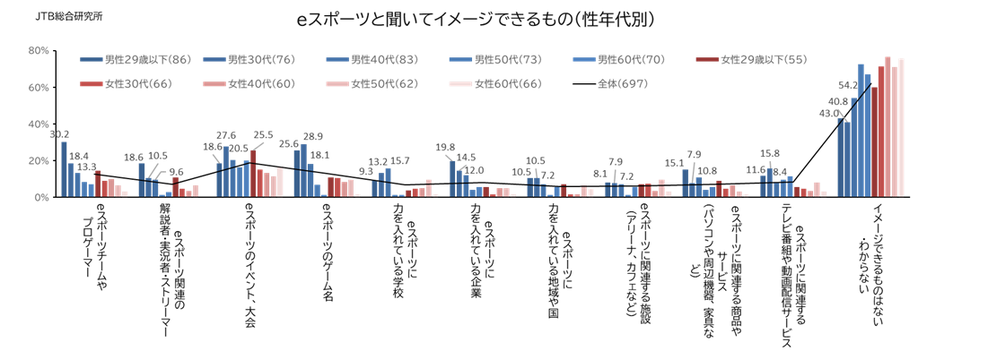 また、男性30代では「eスポーツのゲーム名(28.9%)」、男性40代と女性29歳以下では「eスポーツのイベント、大会(20.5%/25.5%)」が最も高く、男性40代では「eスポーツに力を入れている学校(15.7%)」も上位に来ており、年代・性別毎のeスポーツとの関わり方によって具体的にイメージできるものが異なりました(図10)。