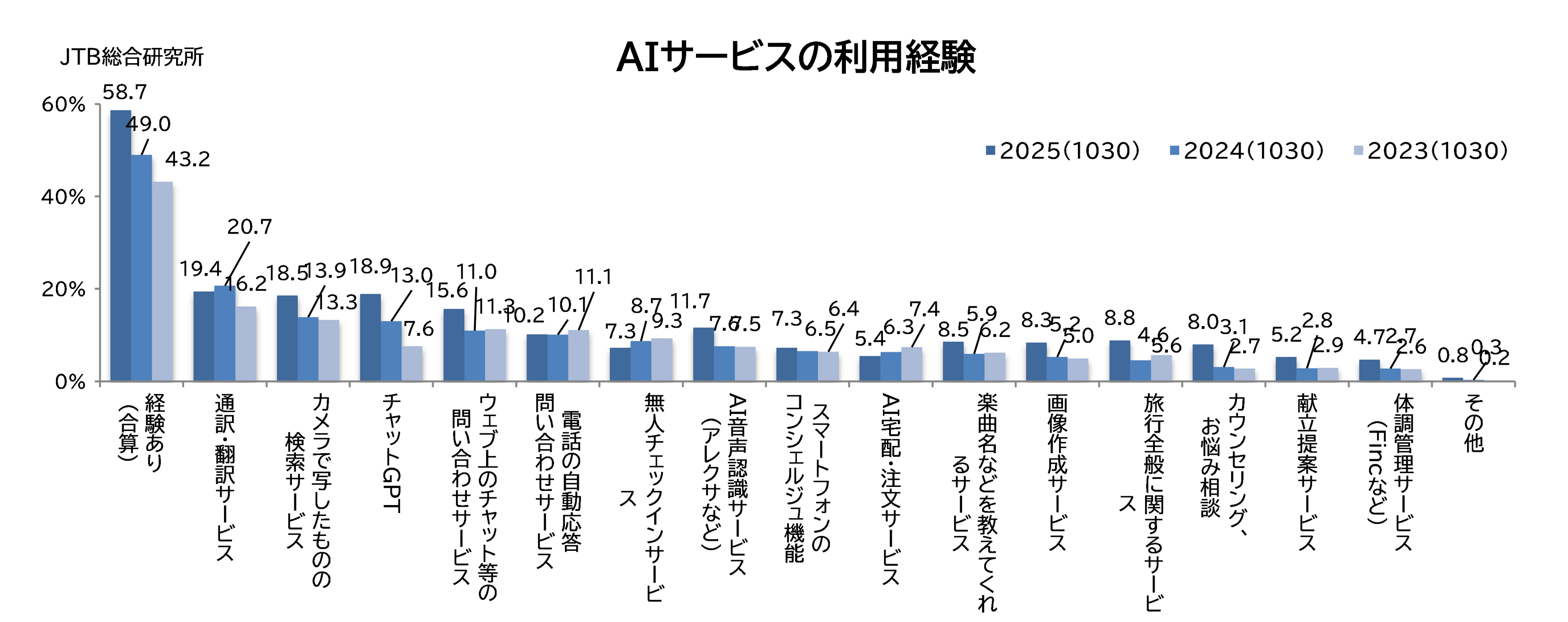 6.AIサービスの利用経験は、58.7%と前年より約10ポイント上昇。旅先で利用してみたいAIサービスは、「旅行先のグルメ情報検索(29.6%)」、「言語翻訳(25.1%)」、「行程・ルート提案(24.7%)」などが上位に。