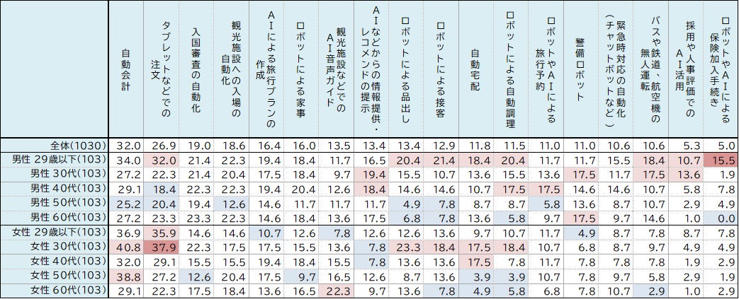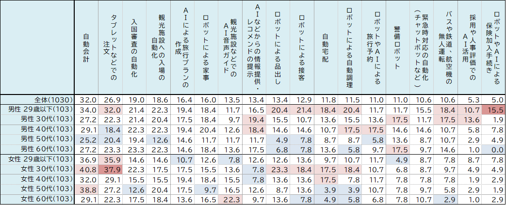また、AIに限らない「無人サービス」の利用意向については、「自動会計(32.0%)」、「タブレットなどでの注文(26.9%)」、「入国審査の自動化(19.0%)」など、手続きを効率化できるサービスが、「旅行プランの作成(16.4%)」、「音声ガイド(13.5%)」、「レコメンドの提示(13.4%)」などの付加価値サービスを上回りました。性年代別では、29歳以下の男性で、無人サービスの利用意向が全体的に高い傾向がみられます(表3)。