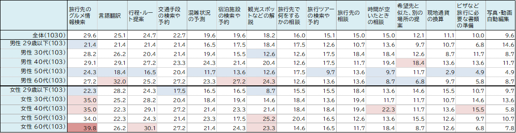 (表2) 旅先で利用したいAIサービス(性年代別)