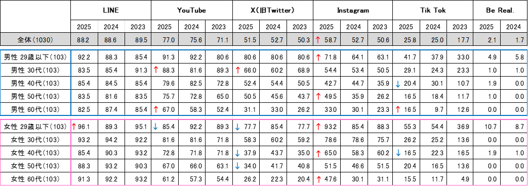 スマートフォンで利用する主なSNSや動画投稿サービスとしては、「LINE」、「YouTube」、「Instagram」、「X」となり、上位の顔ぶれは昨年と変わりませんでしたが、「LINE」と「X」はやや減少し、「Instagram」が「X」を超えて3位となりました。「X」は特に女性の利用率が減少しています。また、リアルな日常を共有できるとZ世代に人気の「BeReal.」もわずかながら上昇し、29歳以下女性の利用率が10%を超えました(表1)。