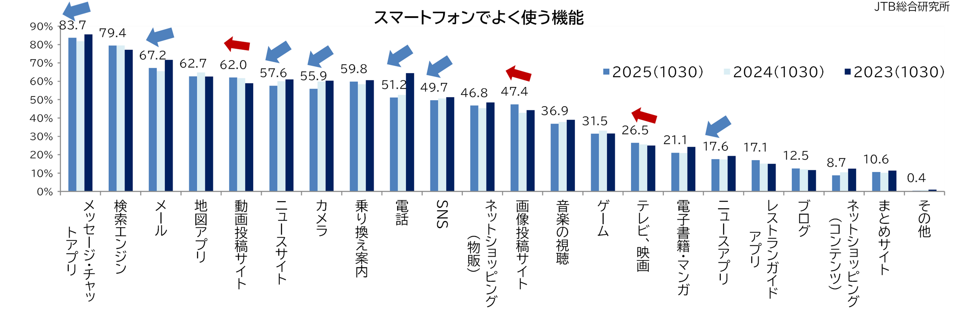 1.スマートフォンでよく使う機能は「メッセージ・チャット」、「メール」などのコミュニケーション手段が減少し、「動画や画像投稿サイト」、「テレビ・映画」などの映像コンテンツ系が上昇。