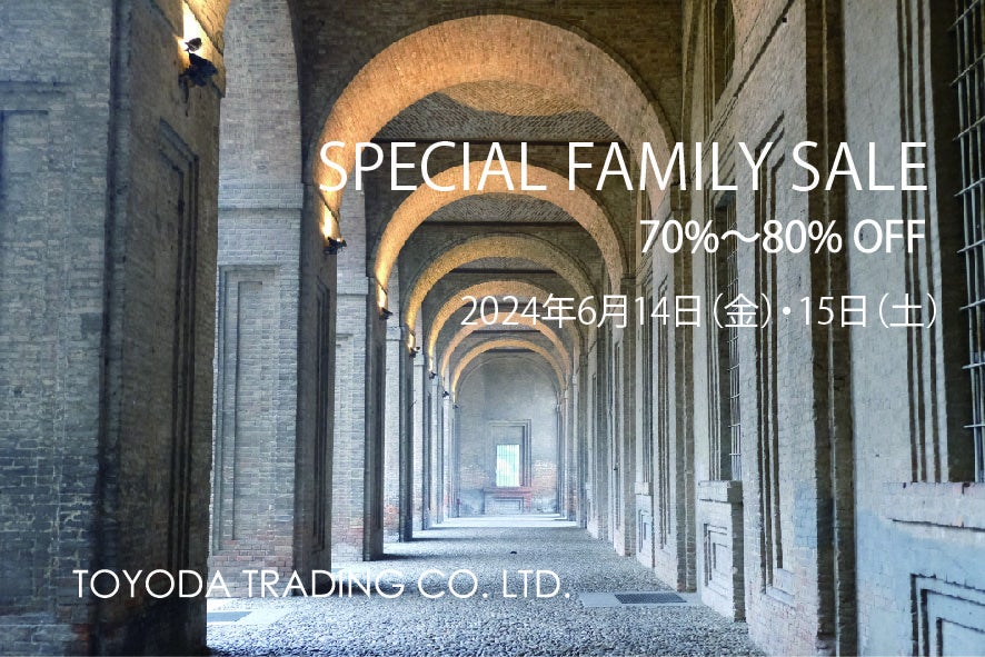 1984年の創業以来、ファッションを通じてヨーロッパの文化を日本に届けている株式会社豊田貿易では2024年6月14日(金)6月15日(土)の2日間限定のスペシャルファミリーセールを事前予約制で開催いたします。