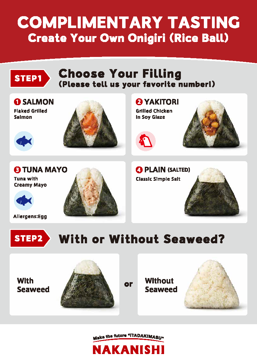 試食: IH立体炊飯機×過熱水蒸気で焼き上げた具材による「できたておにぎり」体験。好みのネタを選び、調理したての味を試食可能。