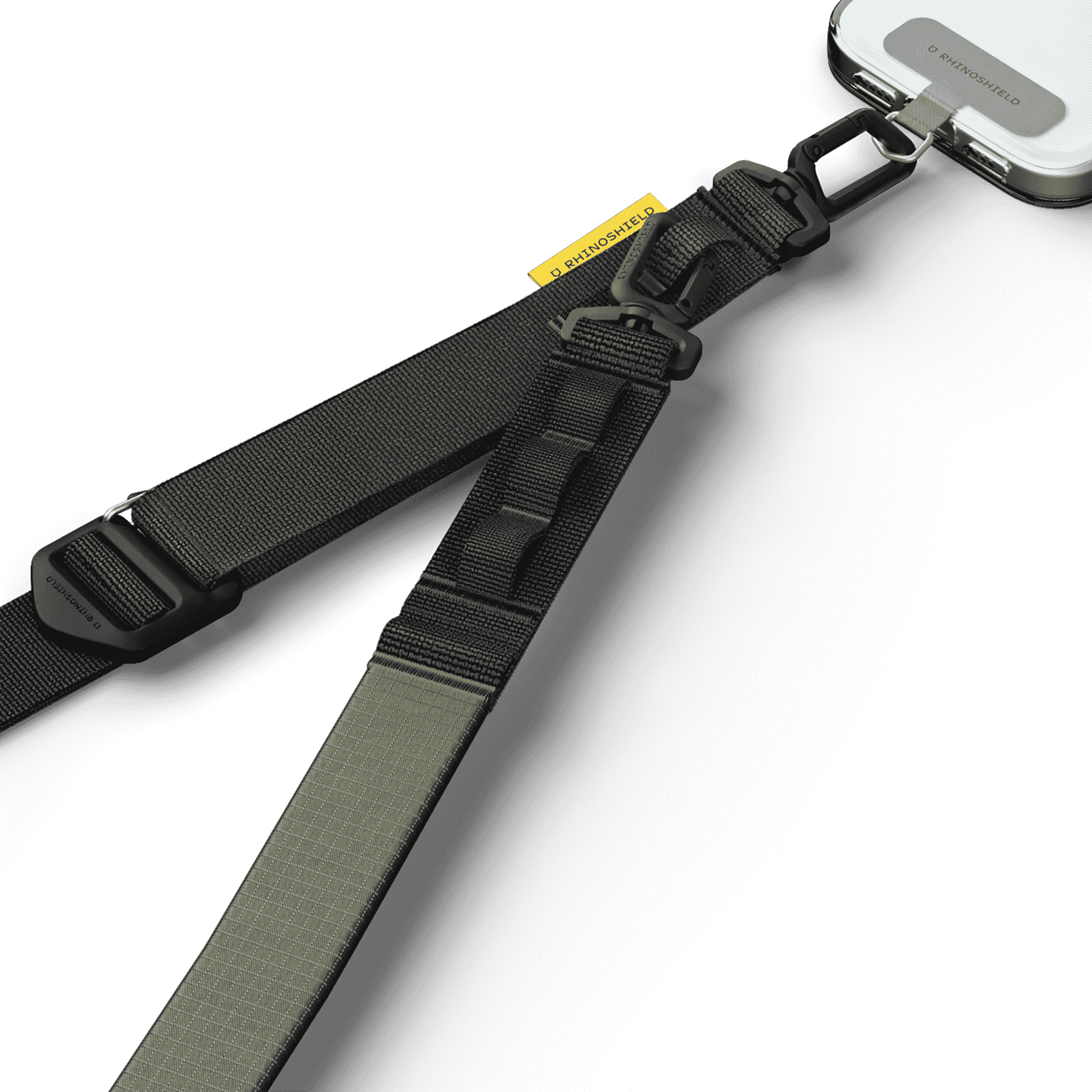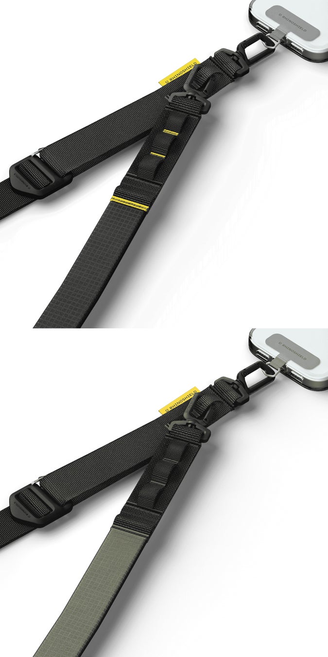 - RHINOSHIELD初採用となる軽量ナイロン製の耐裂性生地で、従来のUtility Crossbody ネックストラップよりも18.93g軽い、シリーズ最軽量※の55gを実現。軽量化+2.5cmの幅広ストラップで身体への負担を軽減し、快適な装用感を叶えます。