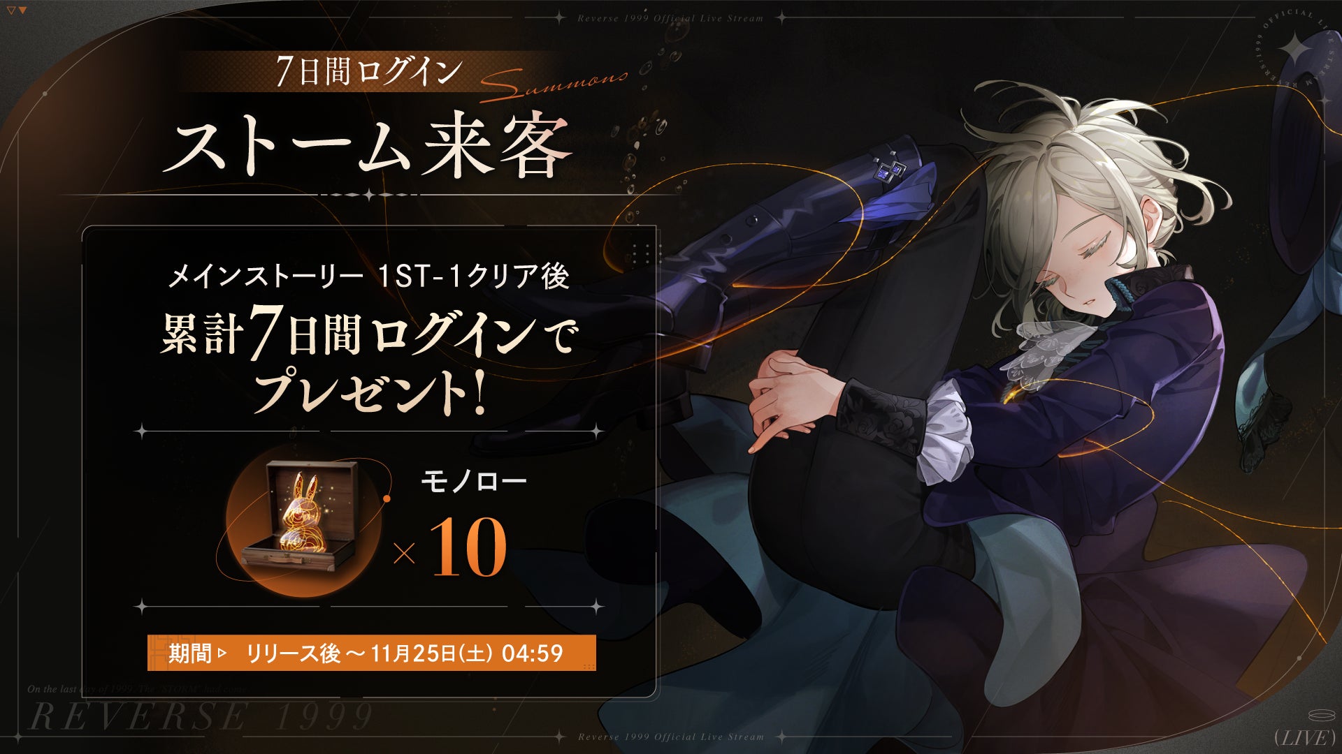 メインストーリー「1ST-1」をクリア後、イベント期間中に累計7日間ログインすると「モノロー×10」が入手できます。