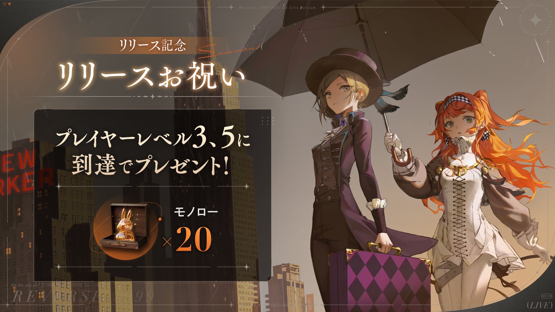 タイムキーパーのレベルが「Lv.3」および「Lv.5」に達したとき、「リリースお祝い」をプレゼント。いずれもゲーム内メールに贈られ、合計で「モノロー×20」を入手できます。