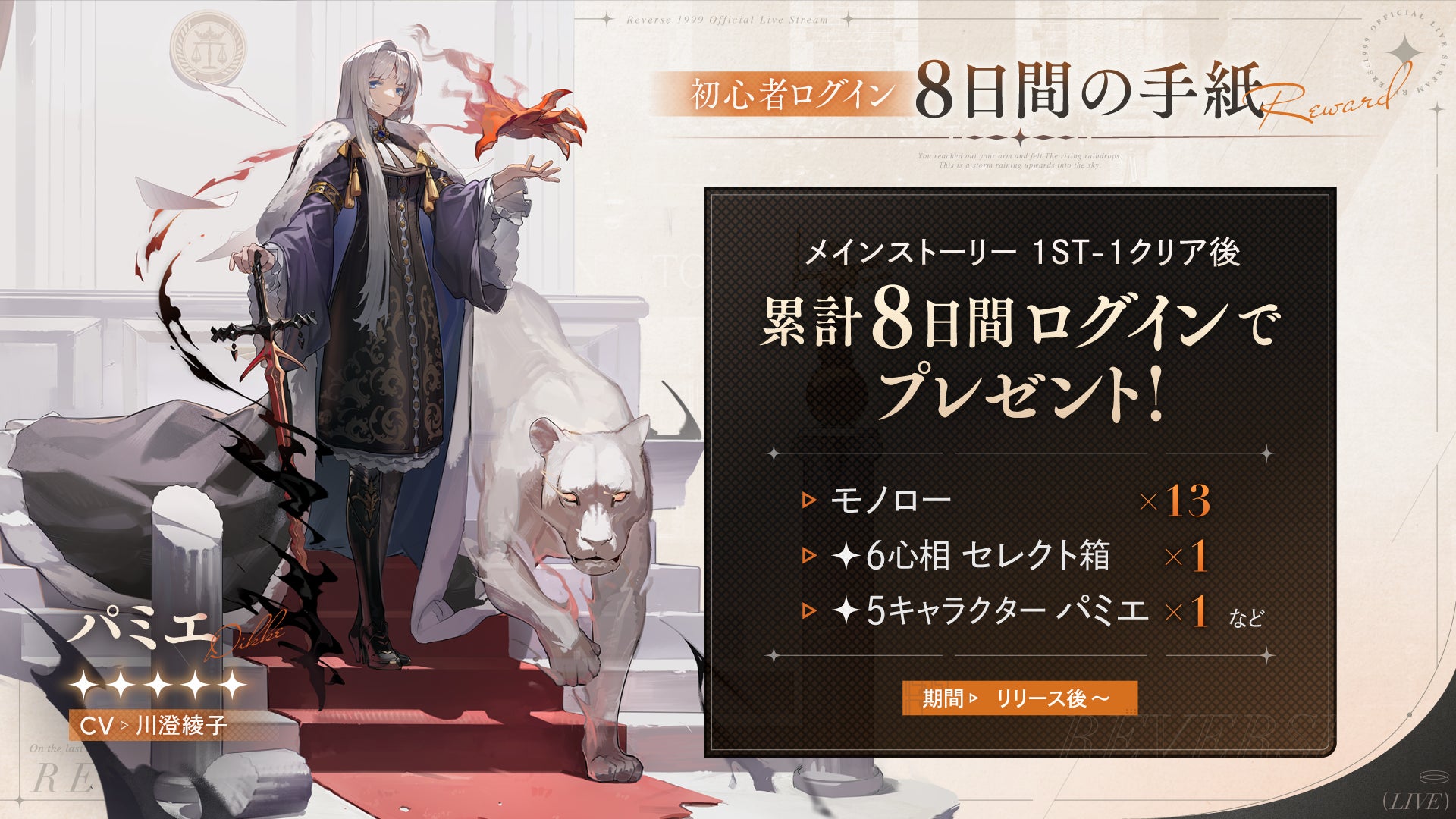 メインストーリー「1ST-1」をクリア後、累計8日間ログインすると「モノロー×13」、「★6心相セレクト箱」、「★5キャラ・パミエ×1」が入手できます。