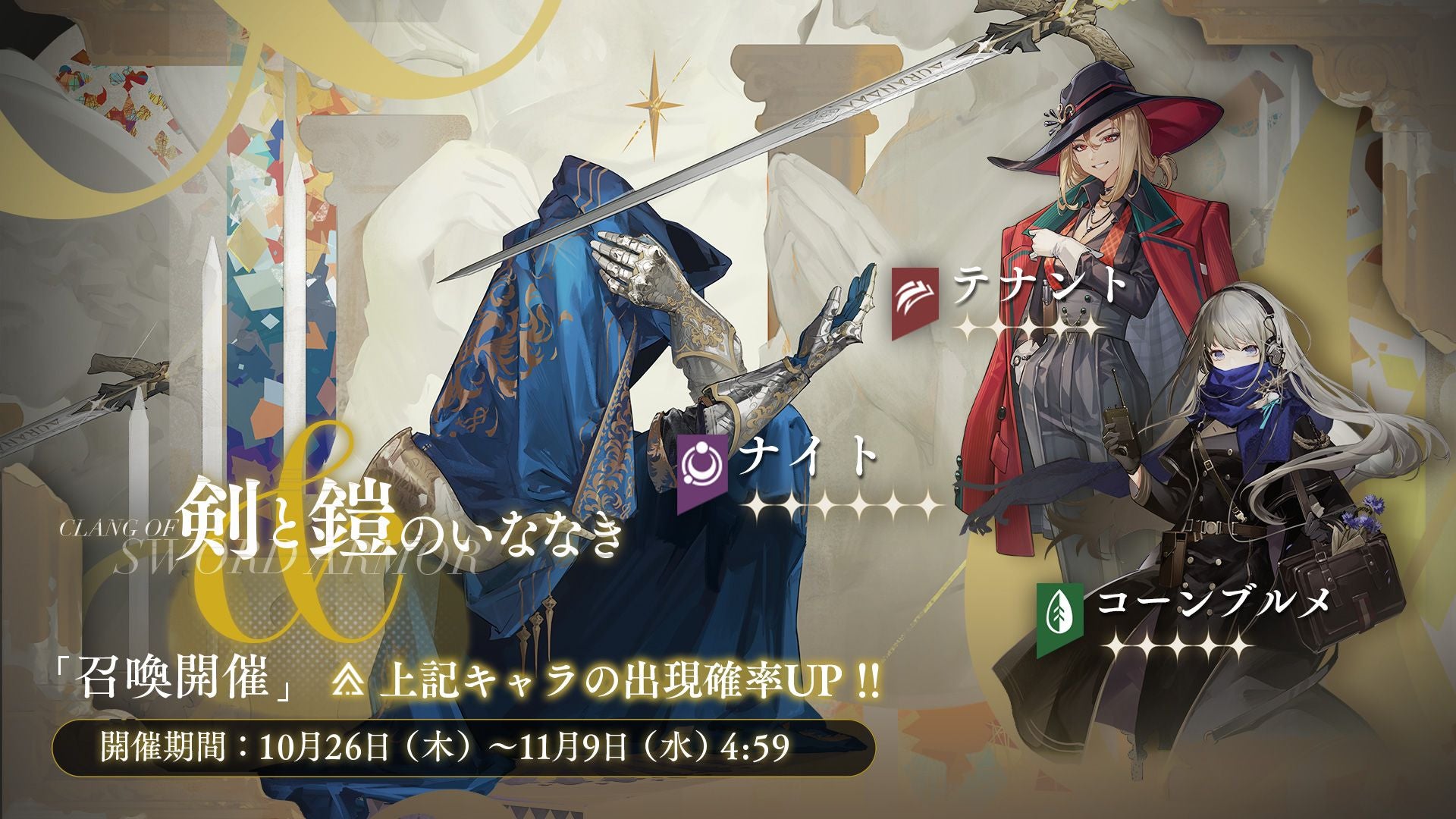 「剣と鎧のいななき」では、★6キャラ「ナイト」、★5キャラ「テナント」および「コーンブルメ」をピックアップ。同じレアリティのキャラに比べて排出率が大幅にアップしています。なお、「1グラムの好奇心」と同様に期間限定の開催となりますので、ご注意ください。