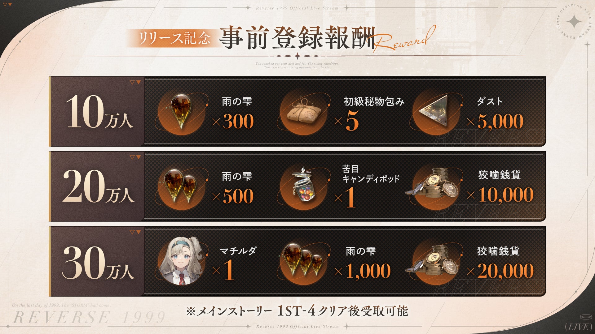 事前登録者数30万人突破の報酬をプレイヤー全員にプレゼントします。メインストーリー「1ST-4」クリアで獲得できますので、「雨の雫」などの便利なアイテムとともに★5キャラクター「マチルダ」をお迎えください。