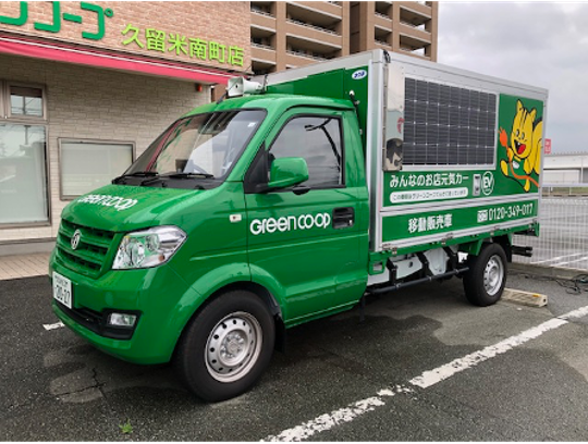 今回の移動販売では姪浜店と久留米南町店発のルートで、電気自動車を導入しました。最新の電気自動車を導入したことで、冷蔵スペースが大幅に広がりました。これにより、冷凍惣菜の輸送だけではなく、温度管理が必要な葉物野菜もこれまで以上に届けることができます。また電気自動車なので二酸化炭素などの温暖化ガスを排出しない、環境にもやさしい販売手段となっています。
