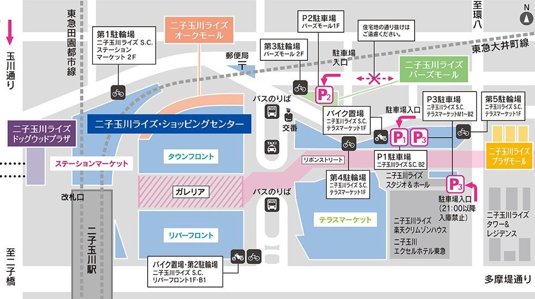 ・P1駐車場 場所 :二子玉川ライズショッピングセンターB2 営業時間 :10:00~25:30 ※最終入庫は25:00まで 300円/30分 平日のみ30分無料 ・P2駐車場 場所 :二子玉川ライズ バーズモール1F 営業時間 :7:00~23:30 300円/30分 平日のみ30分無料 (23:30~翌7:00は200円/1時間) ・P3駐車場 場所 :二子玉川ライズショッピングセンター テラスマーケットM1~B2 営業時間 :7:00~25:30 ※最終入庫は25:00まで 300円/30分 平日のみ30分無料 |