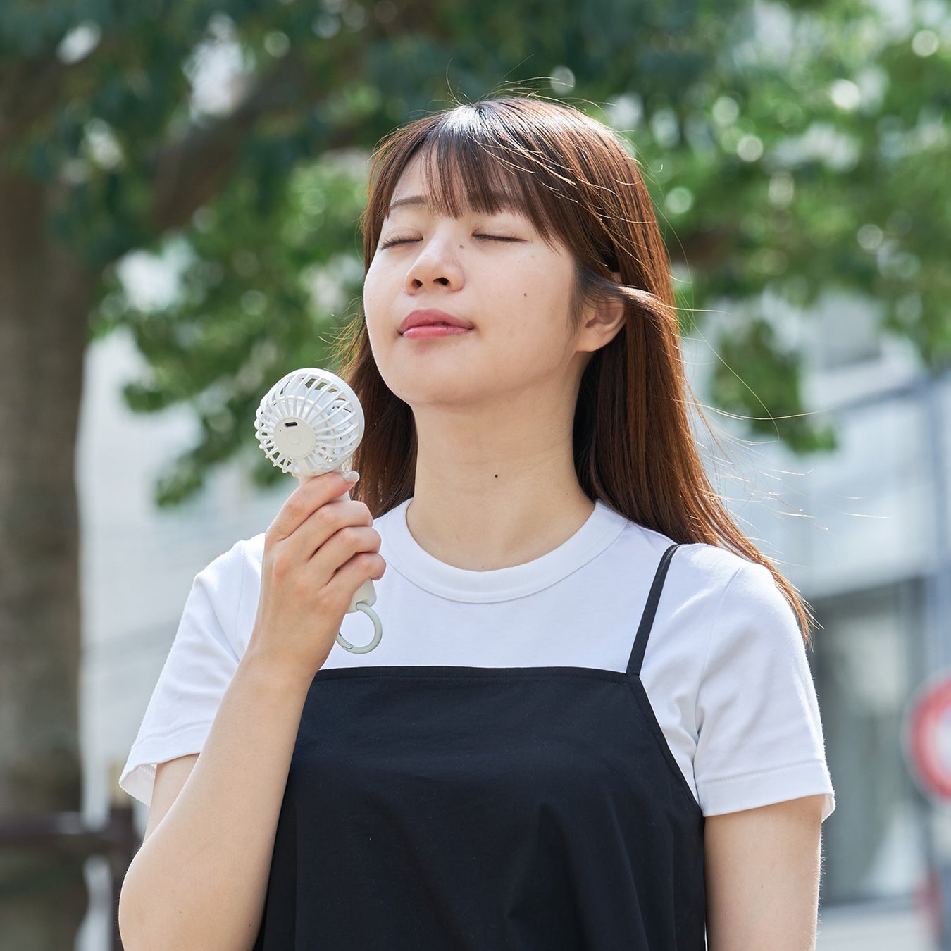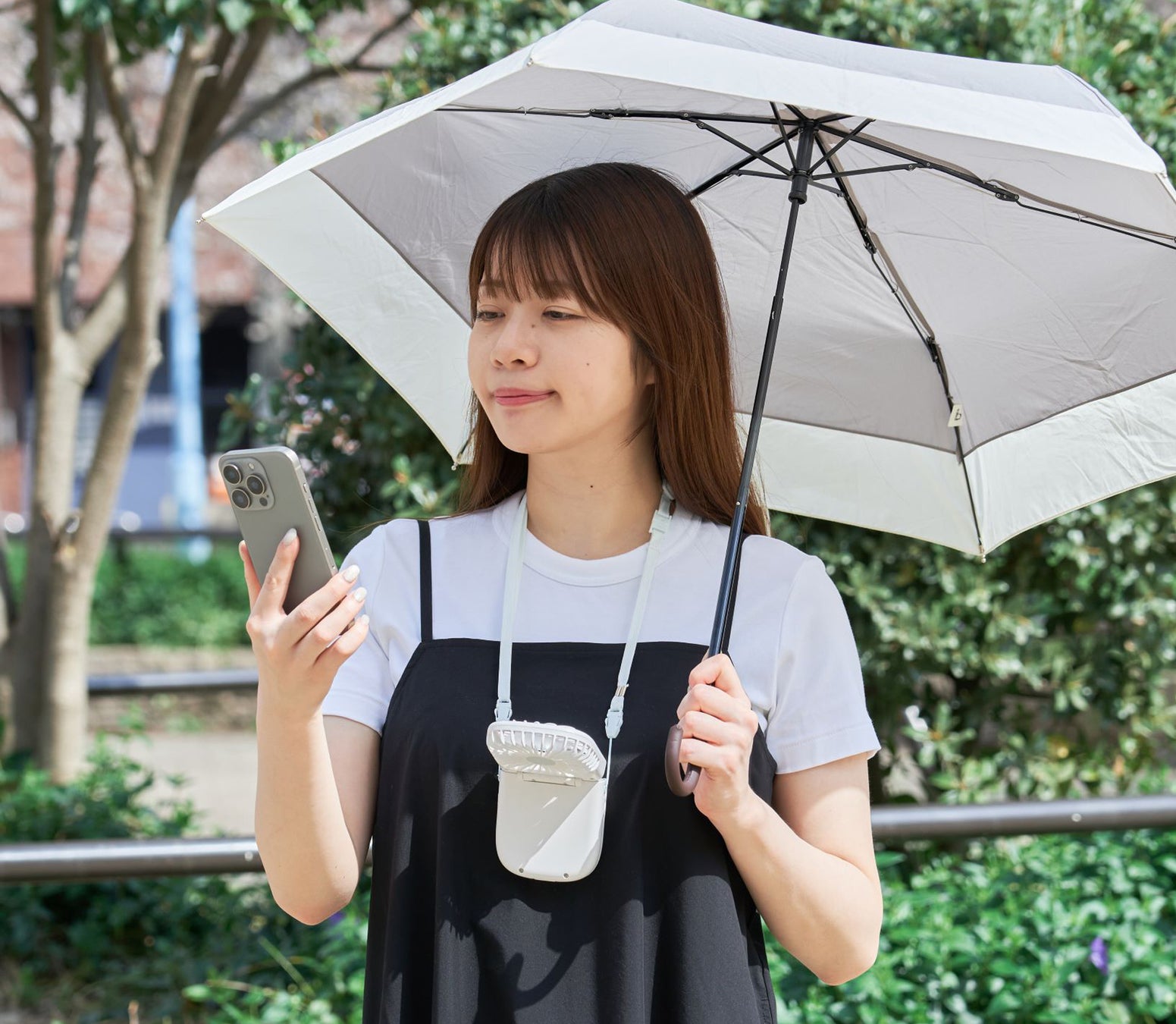折りたたみ&ネックストラップで首から下げた状態で風を浴びることが出来ます。日傘を差しているときも両手を塞がずに涼め、折りたたんでしまえばバッグにもコンパクトに収納可能。