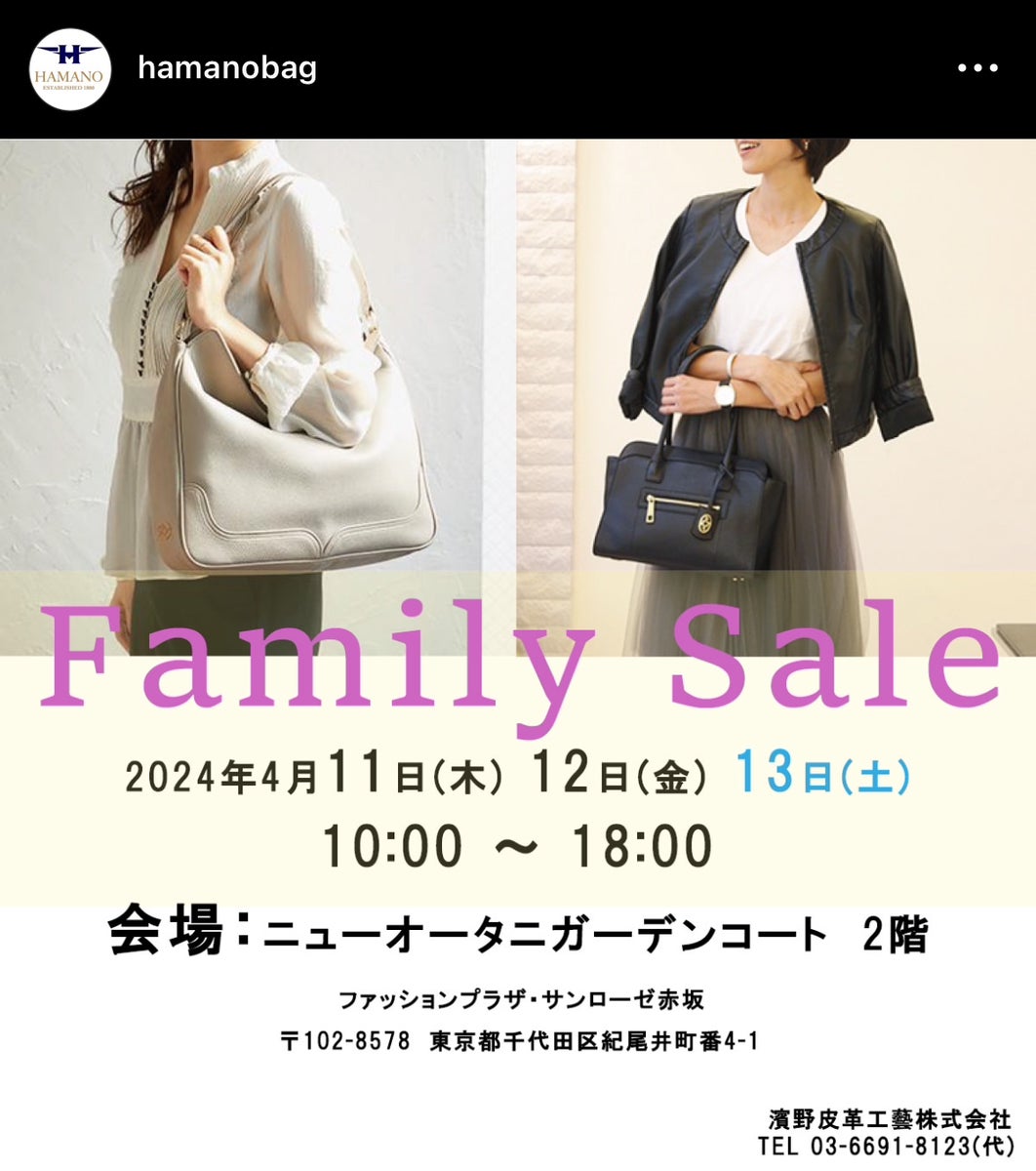 濱野皮革工藝では、オンラインショップで販売していないレアな商品をお手に取ってご購入いただけるファミリーセールを赤坂見附のニューオータニガーデンコート2階にて4月11日(木)~13日(土)の3日間開催します。