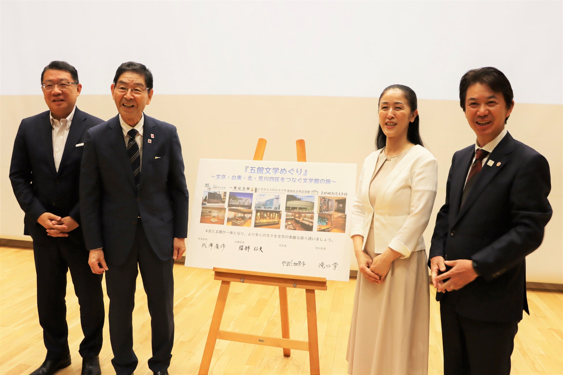 今回荒川区が提案した「五館文学めぐり」に、文京区・台東区・北区の各文学館に賛同いただき、事業を開催できることに大きな喜びを感じています。さらに本日は、文京区の成澤区長、台東区の服部区長、北区のやまだ区長、本事業で連携する3区の区長に荒川区まで足をお運びいただき、御礼申し上げます。本事業を契機に、さまざまな分野においても連携が拡大していくことを、切に願っております。