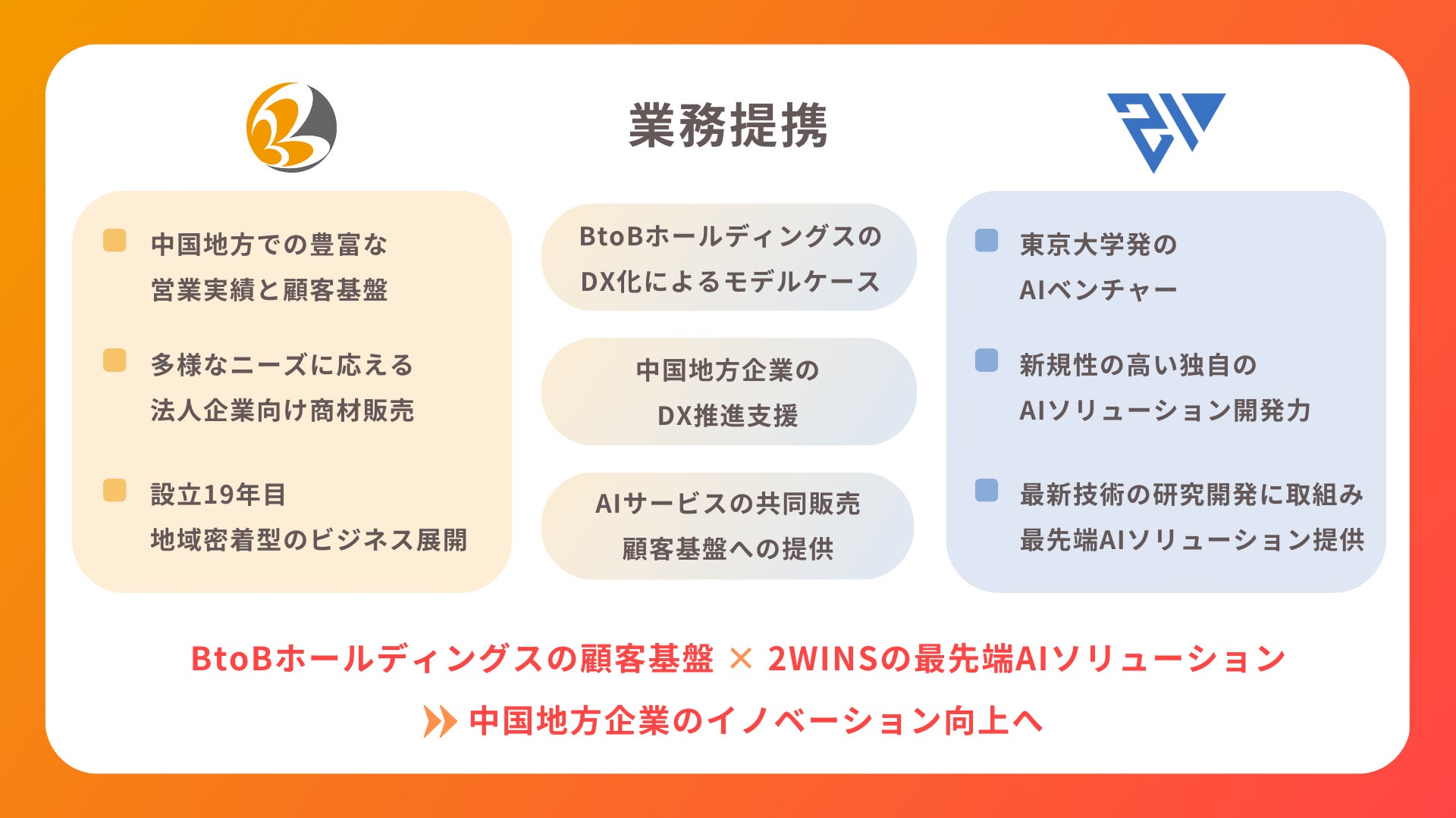 中国地方エリアを中心にWEB・OA ソリューションをはじめとしたBtoB総合サービス業を展開する株式会社BtoBホールディングス(本社:岡山県岡山市、代表取締役:仁科慎太郎、以下「BtoBホールディングス」)と、東京大学発のAI ベンチャー企業である株式会社2WINS(本社:東京都渋谷区、代表取締役:小川椋徹、吉村良太、以下「2WINS」)は、企業向けAIソリューションの販売展開に向けて業務提携を締結いたしました。 本提携により、BtoBホールディングスが培ってきた中国地方での豊富な営業実績と、2WINSが持つ最先端のAI技術を融合し、中国地方企業のイノベーション向上を支援して参ります。