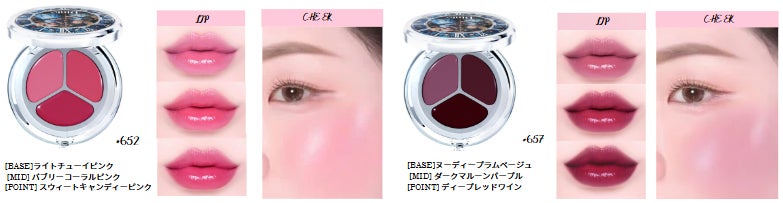 今回の新作リップ&チークアイテムは、3色をひとつのパレットに収め、組み合わせ次第で多彩なメイクバリエーションが可能。質感はマットタイプとグロータイプの2種類をご用意しており、グラデーションを自由自在に演出できます。