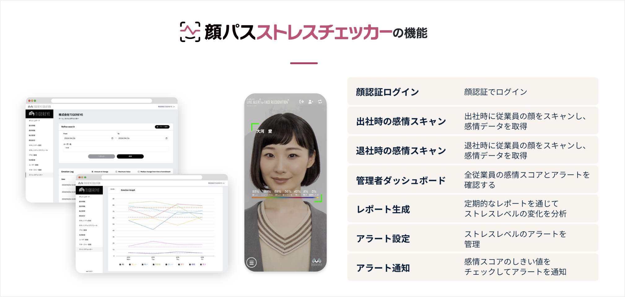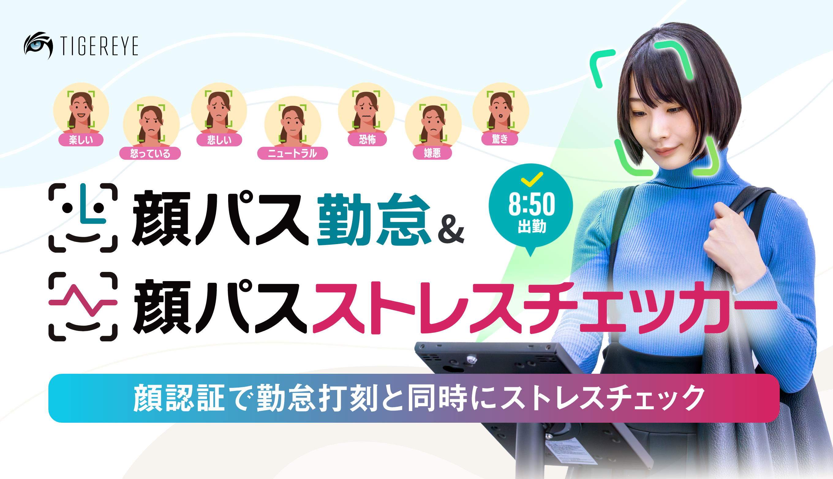 株式会社TIGEREYE(本社:中央区晴海、代表取締役:上村 学、以下「TIGEREYE社」)は、ブラウザで動く顔認証打刻の「顔パス勤怠」と連動して、感情を読み取りストレスを数値化する「顔パスストレスチェッカー」をリリースしました。このサービスは従業員の顔を認識するだけで、勤怠の打刻と感情を同時に読み取り、グラフ化やアラートを通知するものです。