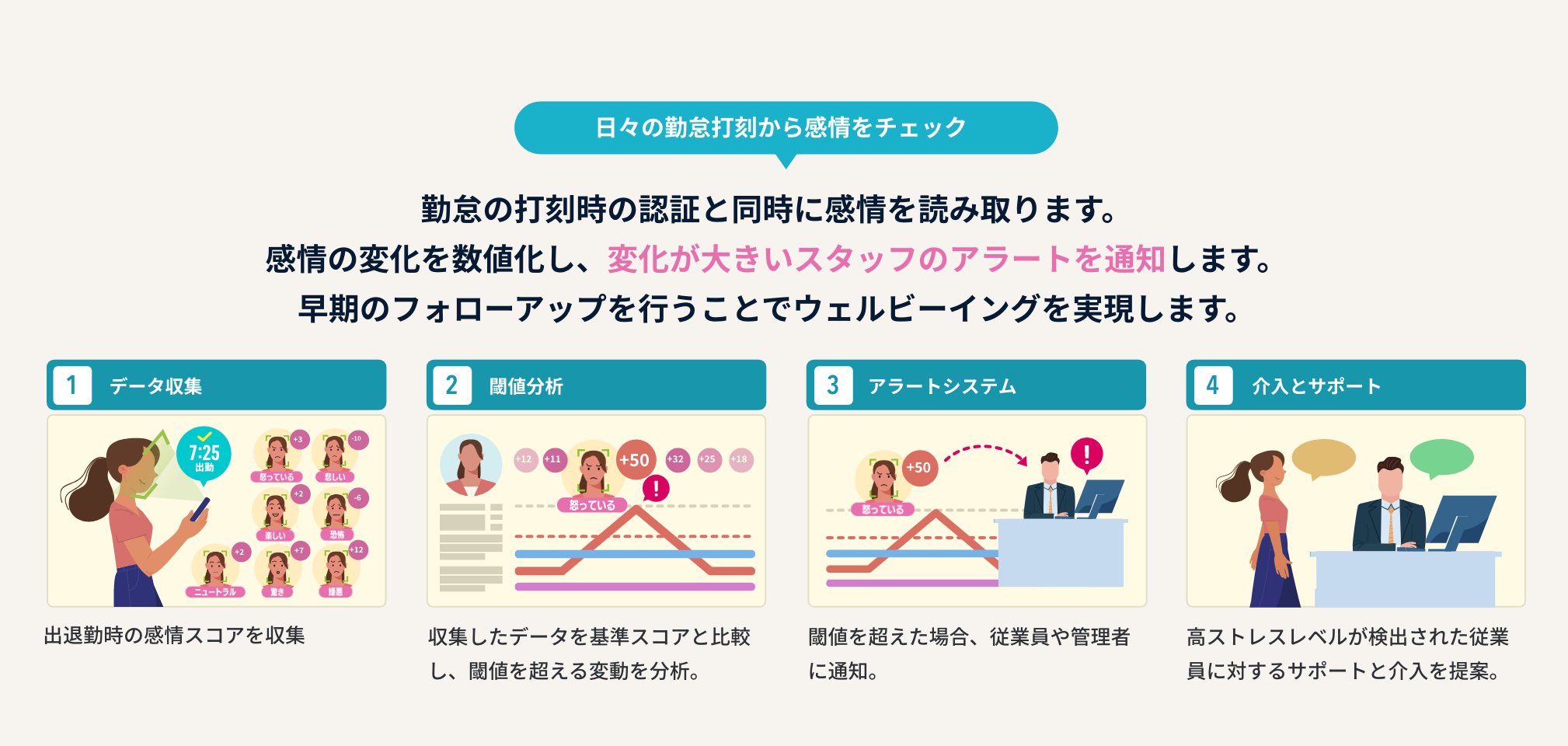 顔パスストレスチェッカーを導入することで、勤怠の打刻時に同時に感情の状態を記録することができます。従業員の出退勤処理と感情記録を一度に行うことで、日々の業務フローの中で感情の変化を見つけることが可能になり、早い段階での1on1やコミュニケーションの実施が可能になり、従業員の健康管理に貢献します。