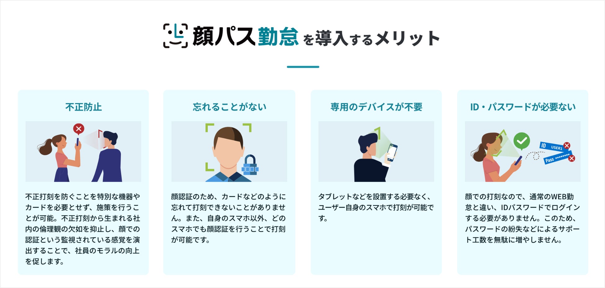 「顔パス勤怠」は、工場や製造業界では、衛生管理の重要性が高く、従来のタイムカードやIDカードによる打刻は衛生上のリスクとなります。それを顔認証打刻とすることで、手ぶらで打刻すことができ、衛生的になり、更になりすましなどの勤怠リスクも回避することが可能になります。顔パス勤怠(打刻)は建築・建設業界や工場・製造業界などさまざまな環境で利用されています。