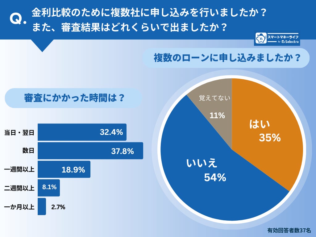 「当日・翌日」・・・32.4%、「数日」・・・37.8%と、多くの場合数日で審査結果は出ています。ただし、きわめて少数ですが、一カ月以上かかった人もいることが分かりました。