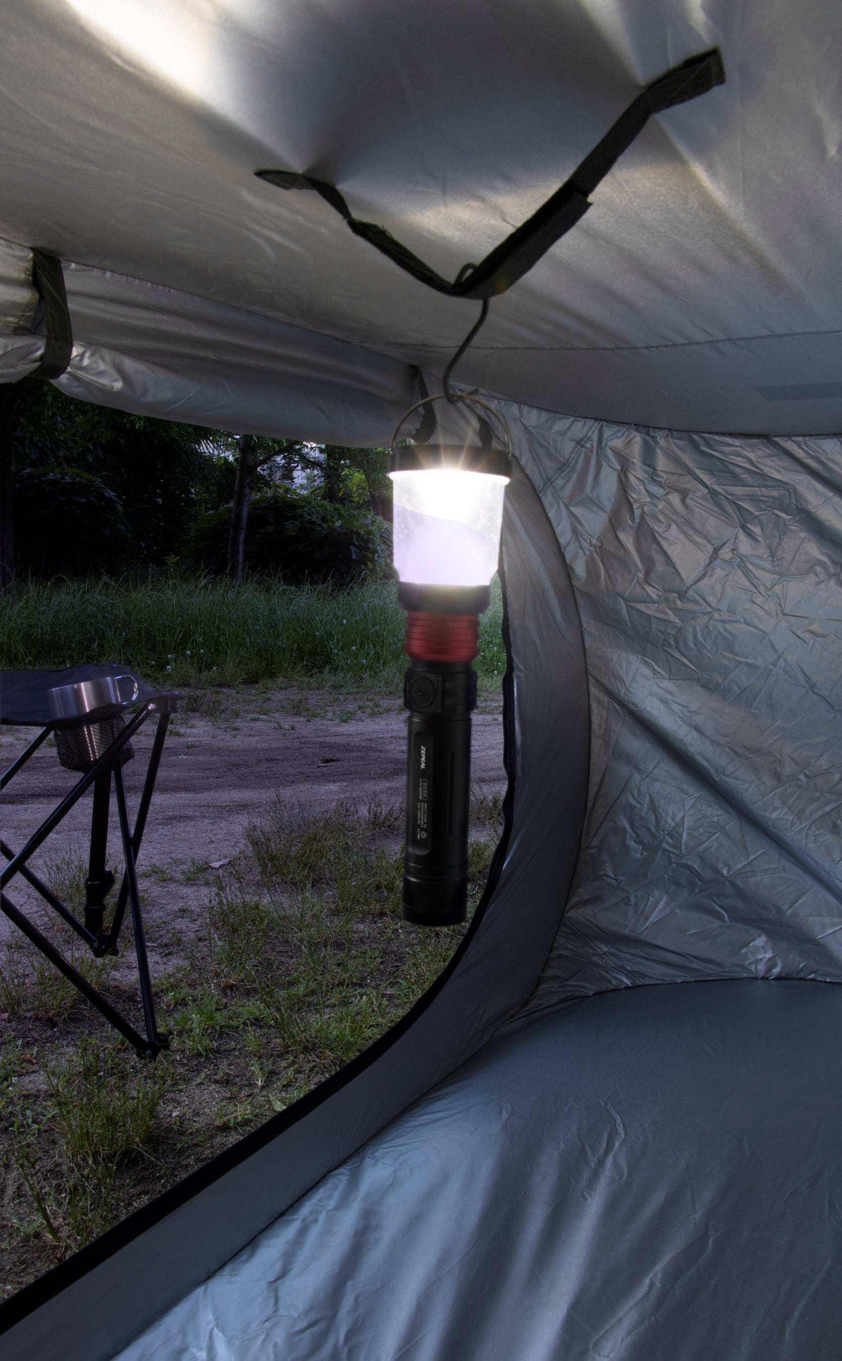 アウトドアや停電時の室内照明での使用に最適。吊り下げフック付きで約5~7㎡の空間を均一に照らし、強モードで約4時間30分、弱モードなら約11時間の長時間点灯が可能です。