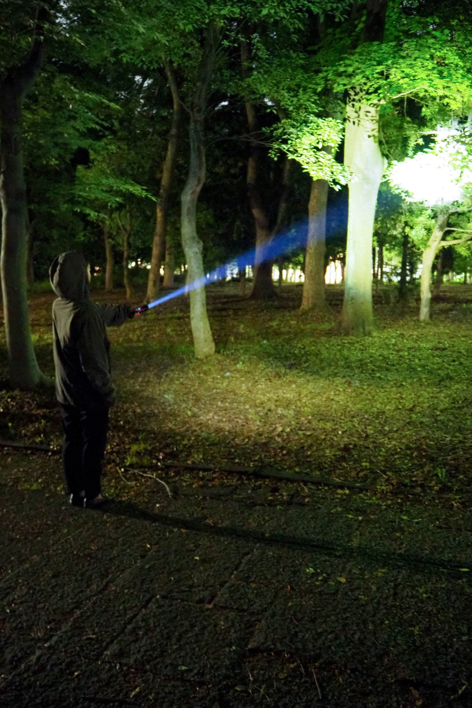 スポット照射では遠方(約198m)への合図が可能で、広角照射では周辺環境(約6~8㎡)が見渡せて夜道の散歩も安心です。