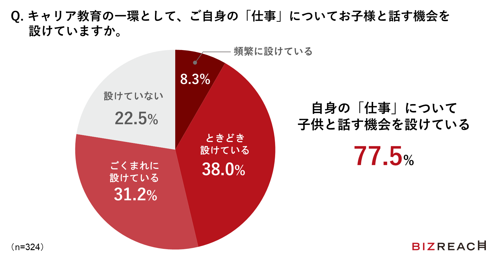形成に役立ったと思うかたずねたところ、役に立ったと感じている方は61.9%にのぼりました。またキャリア教育の一環として自身の仕事について子供と話す機会を設けている方は77.5%となり、多くのビズリーチ会員が意識的に親子で話す機会を設けていることがわかります。