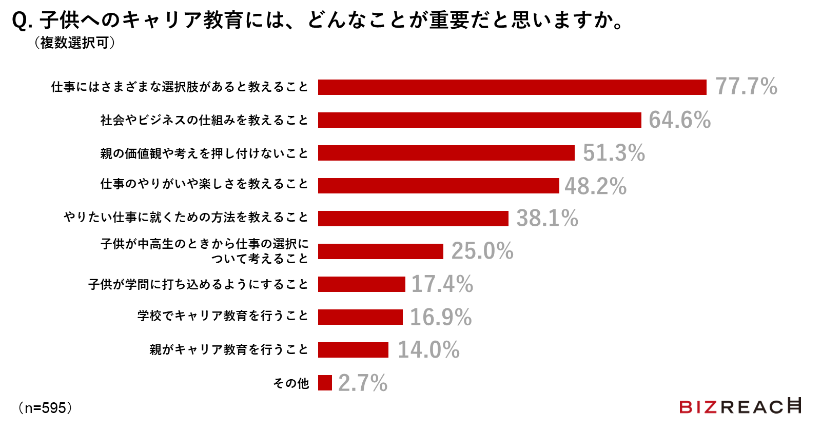 約8割が、自身の「仕事」について子供と話す機会を設けている。重要なことは「仕事にはさまざまな選択肢があると教えること(77.7%)」