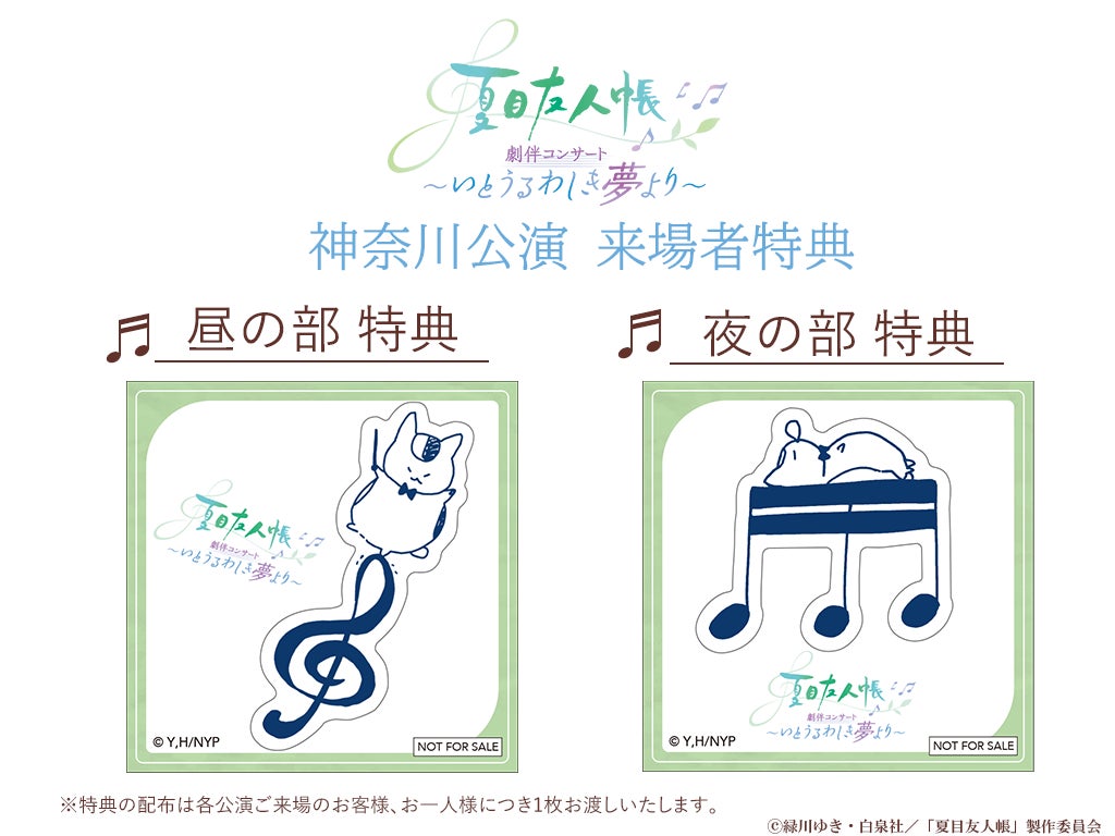 ・本特典は、神奈川公演後に予定している夏目友人帳 アニメ公式オンラインストアの事後通販の購入者特典として数量限定でお渡し予定です。事後通販のご案内は後日予定しております。
