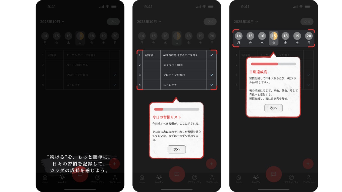 SOULRiZAのルーティン機能は、“小さな行動の積み上げ × “AI信長による伴走” を軸に、継続しやすい習慣体験を提供します。