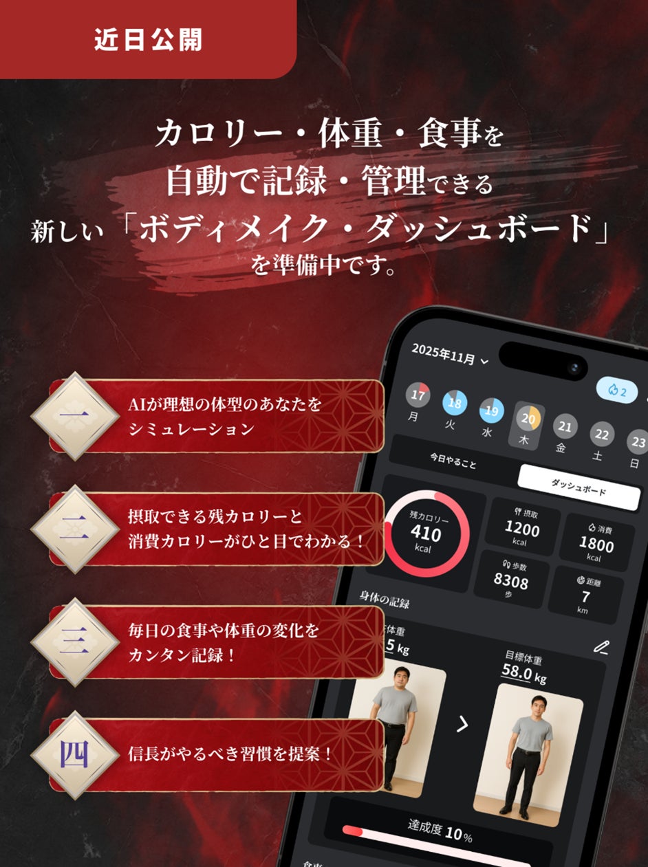 「今日できたこと」「最近続いていること」など、ユーザーの行動データに応じてAI信長が声をかけ、時に優しく、時に力強く寄り添います。単なる記録ではなく、“行動データ × AI信長のパーソナルコーチング” で継続の熱量を生み出します。