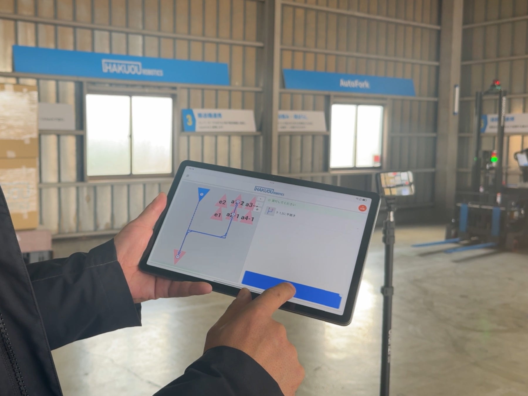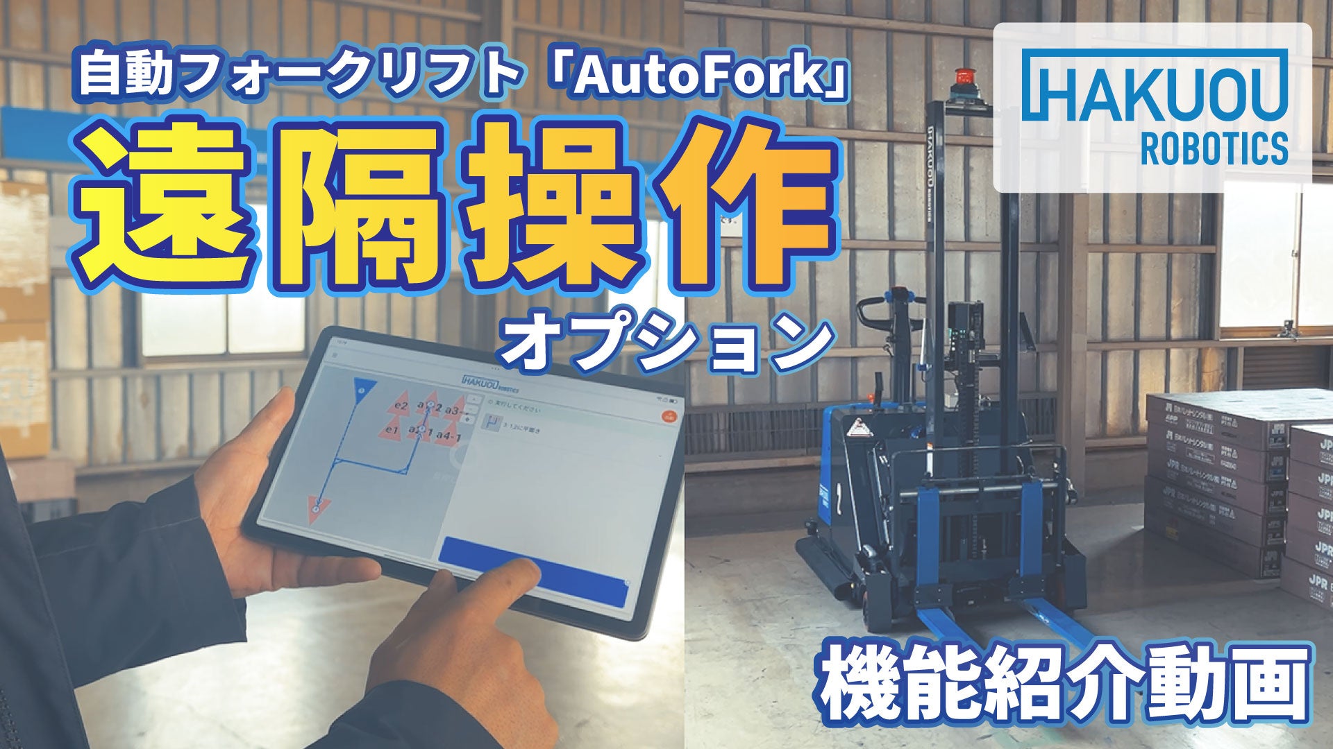 株式会社ハクオウロボティクス(本社:東京都荒川区、代表取締役:鈴木 智広)は、自動フォークリフト「AutoFork」において、専用タブレットから搬送シナリオの実行や機体状態の確認ができる遠隔操作オプションの提供を開始しました。