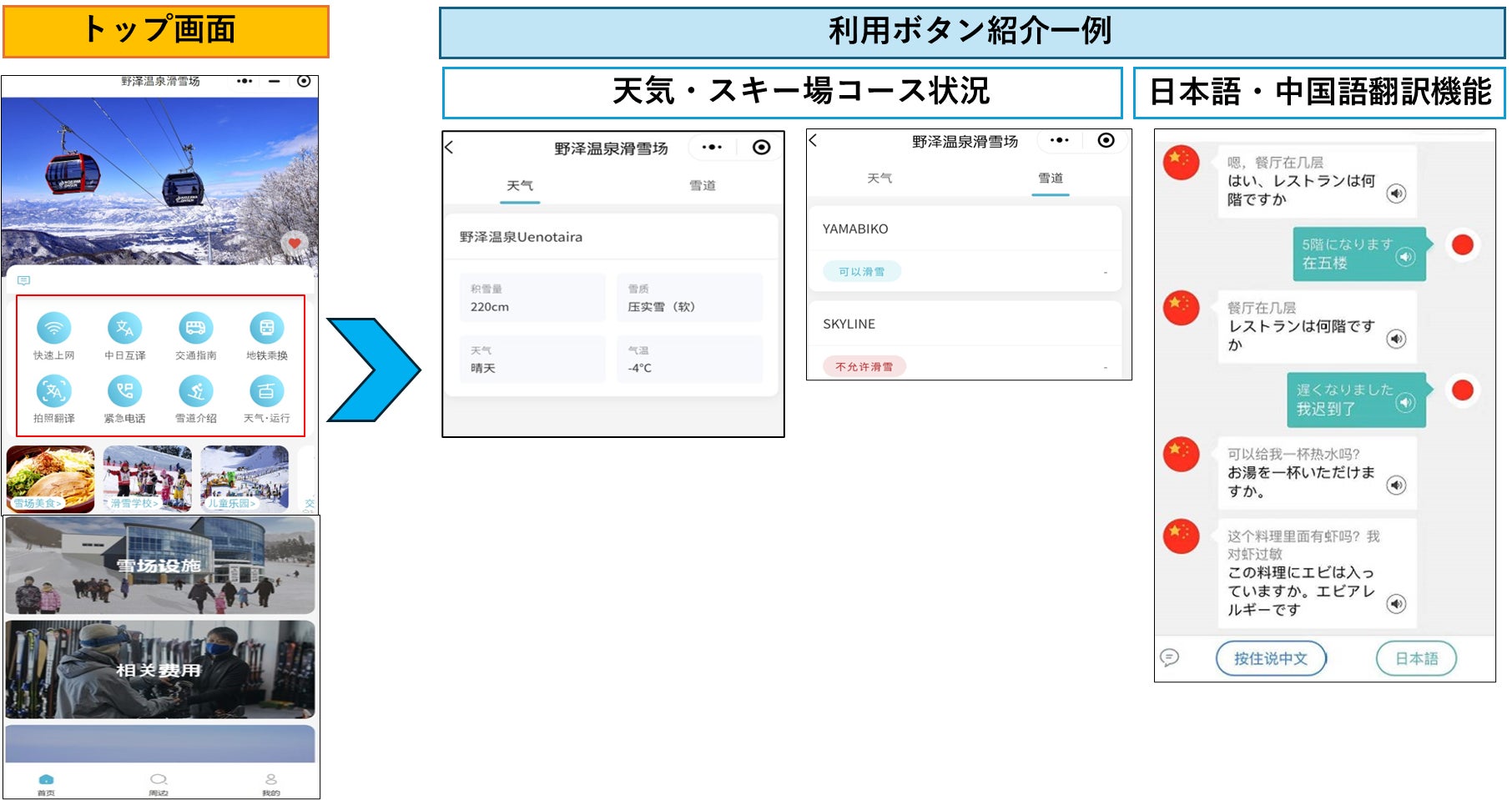 ・リアルタイム情報提供:天候、リフト運行状況、Wechat上で即時確認が可能