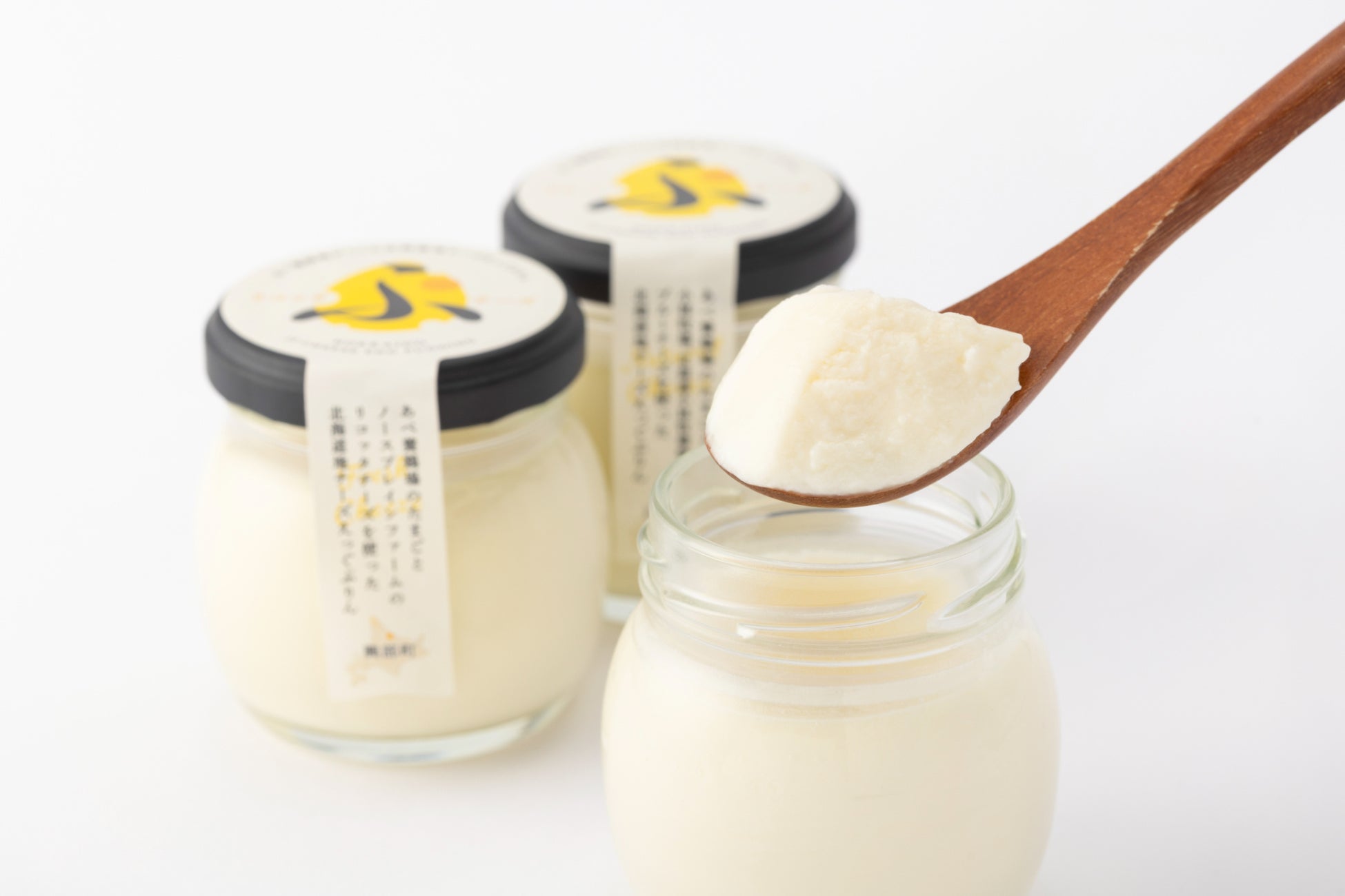あべ養鶏場のえっぐぷりんは、自社養鶏場で採れた新鮮なたまごを使い、素材は全て北海道のものを使用。安心・安全を守り、北海道下川町で一つ一つ丁寧に手作り。卵の甘さを味わってもらうためにカラメルソースをあえて使用せず、卵と牛乳の素朴な味わいが濃厚で深みのある、どこか懐かしい素朴でしっかり食感のぷりんに仕上げています。