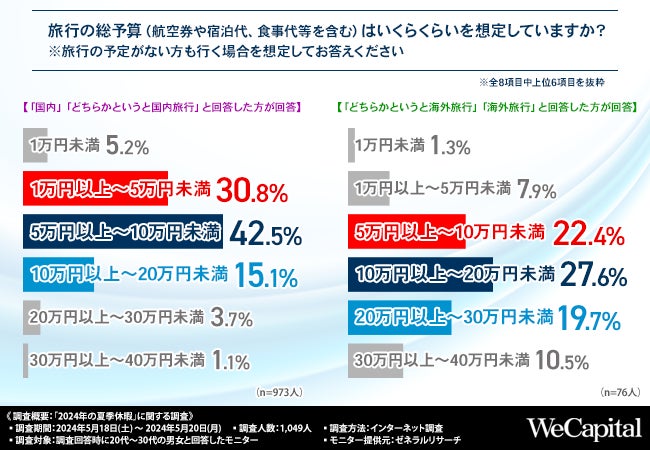 続いて、「海外旅行」「どちらかというと海外旅行」と回答した方では、『10万円以上~20万円未満(27.6%)』と回答した方が最も多く、『5万円以上~10万円未満(22.4%)』『20万円以上~30万円未満(19.7%)』と続きました。