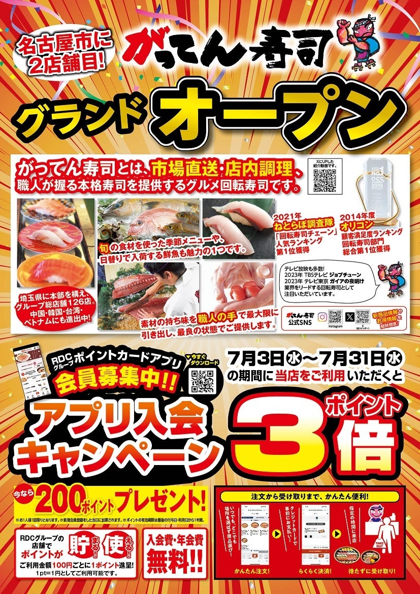 株式会社アールディーシー(代表取締役社長:大島敏彦 本社:埼玉県熊谷市)のグルメ回転寿司業態「がってん寿司」などを運営する株式会社ジーエスアール(取締役社長:阿部康洋)は、がってん寿司イオンモールナゴヤドーム前店を2024年7月3日(水)よりグランドオープンいたします。