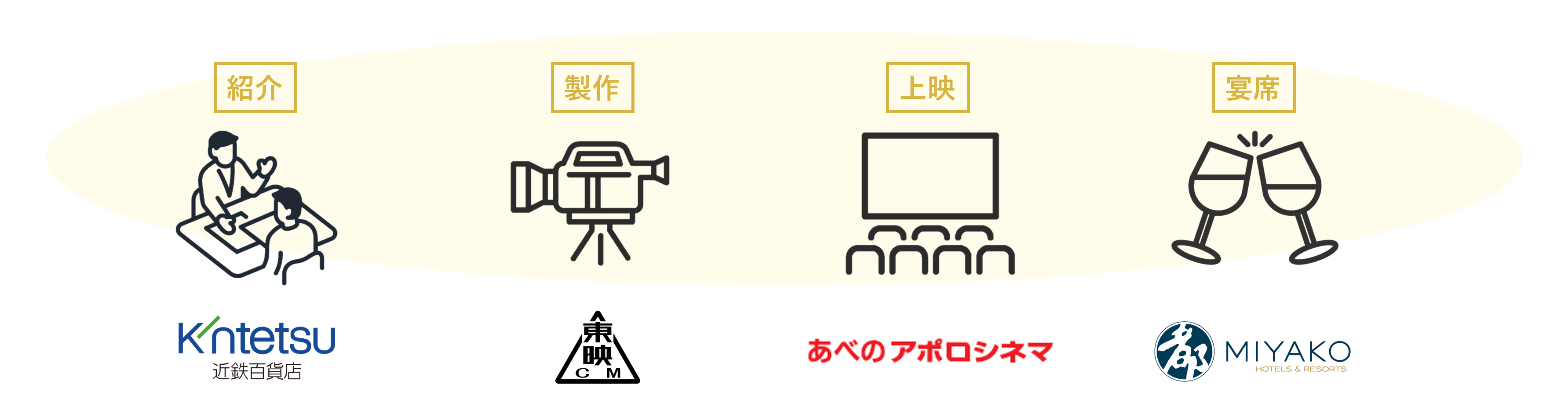 映画館とホテルを備える近鉄グループのアセットを活かし、あべのアポロシネマでの上映会と上映会後の宴席をあべの・天王寺で完結させることで、地域に密着した共感を生み出します。